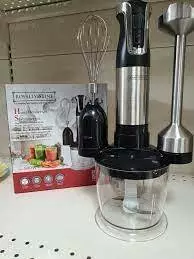 Комплектація блендера складається з віночка для збивання вершків, яєць, приготування кремів та подрібнювача, на базу якого легко та просто встановлюється блендер. На додаток до всього Ви отримуєте додатковий тримач для блендера та віночка, а також склянку для збивання. Блендер легко розбирається і нескладно утримувати у чистоті.