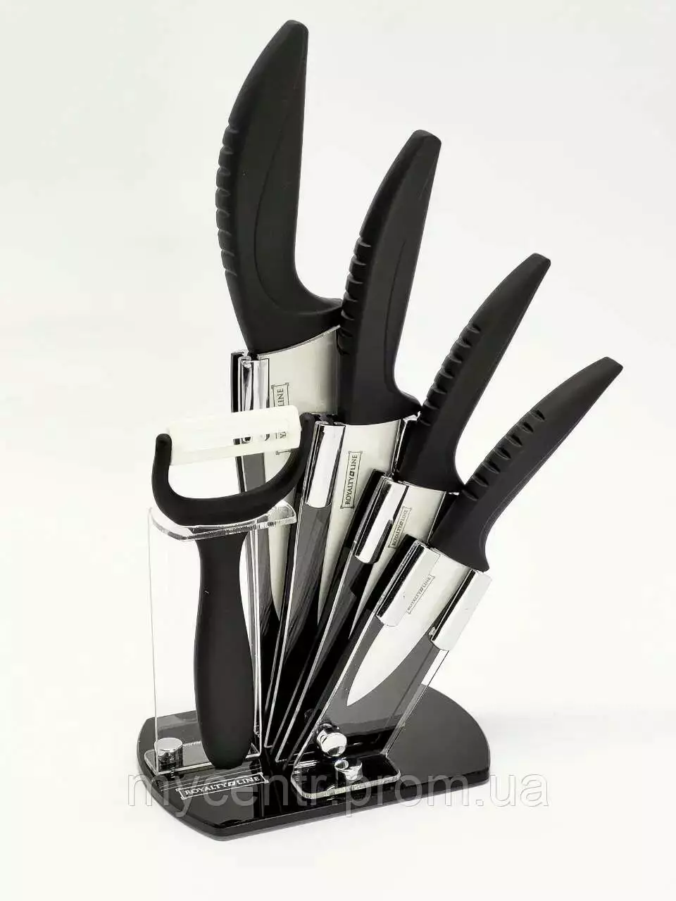 Royalty Line RL-C4SB - набір керамічних кухонних ножів від швейцарської торгової марки Royalty Line. Модель досить ергономічна та зручна у використанні. У наборі чотири ножі різного розміру й овочечистка. Є підставка для зручнішого зберігання ножів. Вона компактна, не займає багато місця.